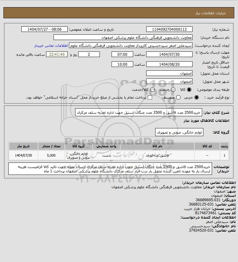 توضیحات خریدار:خرید2500 عدد قاشق و 2500 عدد چنگال استیل جهت اداره تغذیه سلف مرکزی ارسال نمونه جهت تائید کالا الزامیست هزینه ارسال بار به عهده تامین کننده تحویل بار درب انبار سلف مرکزی دانشگاه علوم پزشکی اصفهان پرداخت 1 ماه