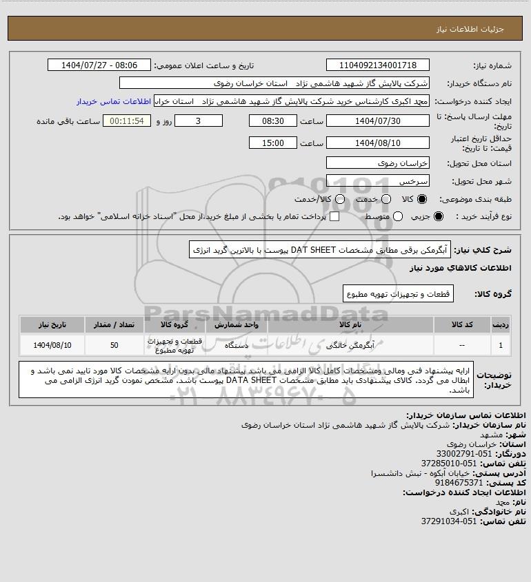 نام دستگاه خریدار:شرکت پالایش گاز شهید هاشمی نژاد استان خراسان رضوی