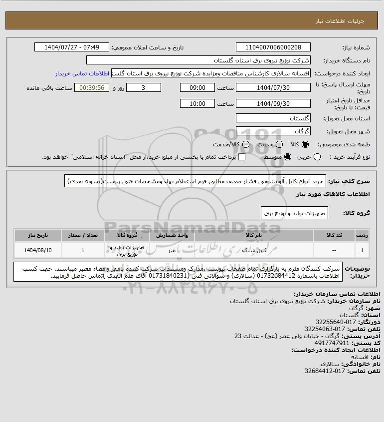 شرح کلی نیاز: خرید انواع کابل آلومینیومی فشار ضعیف مطابق فرم استعلام بهاء ومشخصات فنی پیوست(تسویه نقدی)