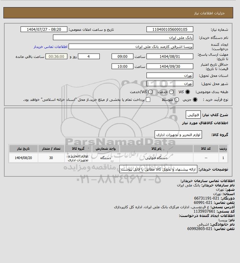 | 1 | -- | دستگاه فتوکپی | دستگاه | لوازم التحریر و تجهیزات اداری | 30 | 1404/08/20 |