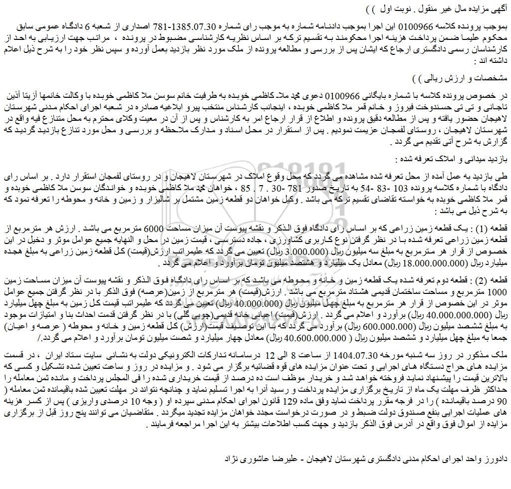 بموجب پرونده کلاسه 0100966 این اجرا بموجب دادنامه شماره به موجب رای شماره 1385.07.30-781 اصداری از شعبه 6 دادگاه عمومی سابق محکوم علیما ضمن پرداخت هزینه اجرا محکومند به تقسیم ترکه بر اساس نظریه کارشناسی مضبوط در پرونده  ،  مراتب جهت ارزیابی به احد از کارشناسان رسمی دادگستری ارجاع که ایشان پس از بررسی و مطالعه پرونده از ملک مورد نظر بازدید بعمل آورده و سپس نظر خود را به شرح ذیل اعلام داشته اند :