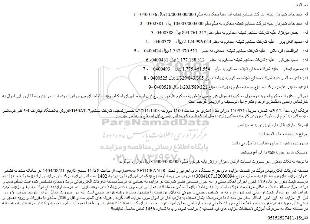 مزایده از ساعت 8 تا 11 صبح تاریخ 1404/08/21 در سامانه ستاد به نشانی سایت ستاد ایران سامانه تدارکات الکترونیکی دولت در قسمت مزایده های حراج دستگاه های اجرایی و تحت عنوان مزایده های قوه قضائیه به شماره حراج 3004107132000094 به فروش می رسد توضیح اینکه در اجرای قانون بودجه 1402 اشخاص برای شرکت در مزایده و ارائه پیشنهاد قیمت باید ده درصد قیمت مقرر در ماده 129 قانون اجرای احکام مدنی را به عنوان تضمین نقدی شرکت در مزایده به حسابی که توسط سامانه تدارکات الکترونیکی دولت (ستاد) مشخص شده است تسلیم نماید و برنده مزایده مکلف است حداکثر ظرف مدت یک ماه نسبت به پرداخت باقیمانده ثمن معامله اقدام نماید و در صورت عدم پرداخت در موعد مقرر ، ده درصد اولیه به نفع دولت ضبط و مزایده تجدید خواهد شد . مزایده از قیمت ارزیابی شده شروع و به هر شخص حقیقی یا حقوقی که بالاترین قیمت را پیشنهاد نماید فروخته خواهد. بدیهی است که در صورت تمایل برای بازدید ظرف 5 روز قبل از مزایده به این اجرا احکام مدنی مراجعه تا با درخواست ایشان نسبت به بازدید آنان از اموال مورد مزایده اقدام گردد . هزینه های تنظیم سند و نقل و انتقال مطابق با مقررات و رویه قضایی و بدهی های معوق به عهده فروشنده و تخلیه تابع مقررات قانونی بوده و ارتباطی به این اجرا ندارد . ضمنا برای کسب اطلاعات بیشتر در رابطه با نحوه ثبت نام و نحوه شرکت در مزایدهای قوه قضائیه در سامانه ستاد به سربرگ آموزش (مستندات مزایده های قوه قضائیه ) مراجعه نموده و یا با شماره 1456 تماس حاصل نمایند%