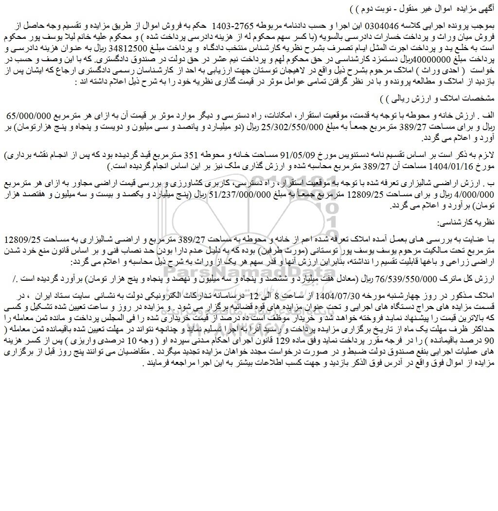 بموجب پرونده اجرایی کلاسه 0304046 این اجرا و حسب دادنامه مربوطه 2765-1403 حکم به فروش اموال از طریق مزایده و تقسیم وجه حاصل از فروش میان وراث و پرداخت خسارات دادرسی بالسویه (با کسر سهم محکوم له از هزینه دادرسی پرداخت شده ) و محکوم علیه خانم لیلا یوسف پور محکوم است به خلع ید و پرداخت اجرت المثل ایام تصرف بشرح نظریه کارشناس منتخب دادگاه و پرداخت مبلغ 34812500 ریال به عنوان هزینه دادرسی و پرداخت مبلغ 40000000ریال دستمزد کارشناسی در حق محکوم لهم و پرداخت نیم عشر در حق دولت در صندوق دادگستری. که با این وصف و حسب در خواست ( احدی وراث ) املاک مرحوم بشرح ذیل واقع در لاهیجان توستان جهت ارزیابی به احد از کارشناسان رسمی دادگستری ارجاع که ایشان پس از بازدید از املاک و مطالعه پرونده و با در نظر گرفتن تمامی عوامل موثر در قیمت گذاری نظریه خود را به شرح ذیل اعلام داشته اند :
