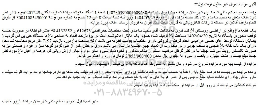 واحد اجرای احکام مدنی شعبه اول شهرستان مراغه جهت اجرای دادنامه 140230390004609630 شعبه 1 دادگاه خانواده مراغه شماره بایگانی 0201229/ج.م 1 در نظر دارد ملک متعلق به مجید ساعدی تازه کند جلسه مزایده ای در تاریخ 1404/07/29 روز سه شنبه ساعت 8 الی 12 صبح به شماره حراج 3004108549000134 از طریق انجام مزایده آنلاین در سامانه تدارکات الکترونیکی به آدرس سایت ستاد ایران به فروش برساند. ملک مورد مزایده: