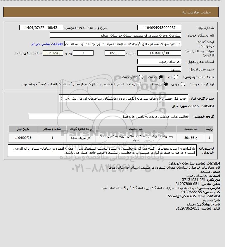 شرح کلی نیاز: خرید غذا جهت پروژه های سازمان (تکمیل نرده نمایشگاه، ساختمان اداری ارتش و ... )