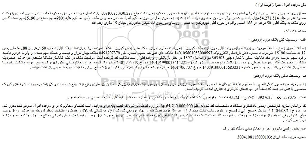 مطابق پرونده اجرایی حاضر در این اجرا براساس محتویات پرونده محکوم علیه آقای علیرضا حسینی محکوم به پرداخت مبلغ 9.085.430.287 ریال بابت اصل خواسته در حق محکوم له احمد علی حاجی احمدی با وکالت مسعود غنی و مبلغ 454.271.514ریال بابت نیم عشر دولتی در حق صندوق دولت لذا با عنایت به معرفی مال از سوی محکوم له یاد شده در خصوص ملک (سهم محکوم علیه (4980سهم مشاع از 15190سهم ششدانگ بر روی ملک به پلاک ثبتی 50 فرعی از 188 اصلی واقع در حوزه ثبتی کهریزک) به نشانی : روستای دورسون اباد خیابان جانبزرگی خیابان 15 متری رفیع اباد