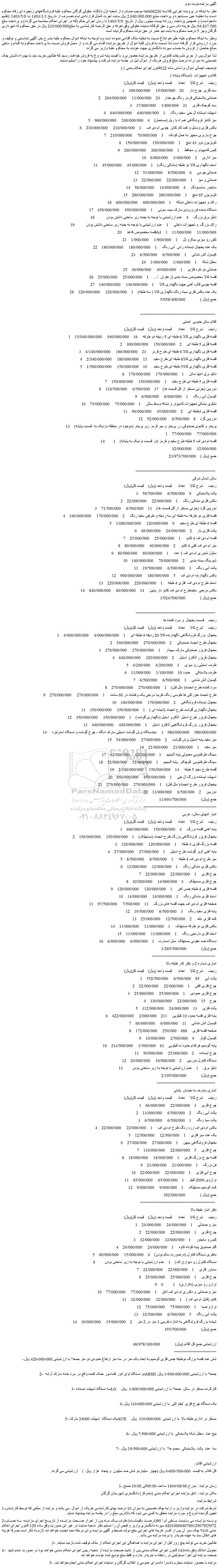 لذا اموال پس از جری تشریفات قانونی از طریق مزایده حضوری و با قیمت پایه شروع به فروش خواهد رسید که طالبین خرید باید با بهمراه داشتن چک تضمینی به میزان ده درصد مبلغ فروش هریک از اموال ذیل در جلسه مزایده شرکت و پیشنهاد خود را تسلیم نمایند.