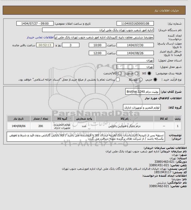 | 1 | -- | درام چاپگر یا فتوکپی یا فکس | عدد | لوازم التحریر و تجهیزات اداری | 200 | 1404/08/06 |