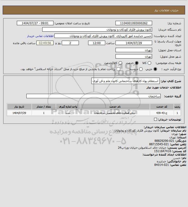 شرح کلی نیاز: استعلام بهاء کارهای ساختمانی کانون علم و فن آوری