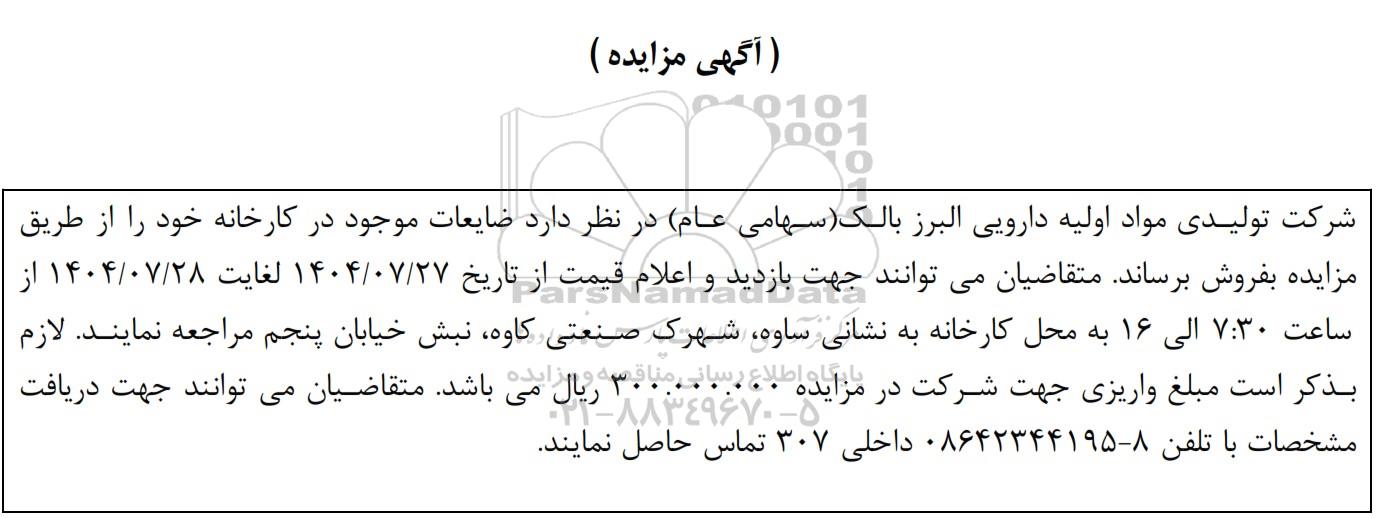 شرکت تولیدی مواد اولیه دارویی البرز بالک (سهامی عام) در نظر دارد ضایعات موجود در کارخانه خود را از طریق مزایده بفروش برساند. متقاضیان می توانند جهت بازدید و اعلام قیمت از تاریخ 1404.07.27 لغایت 1404.07.28 از ساعت 7:30 الی 16 به محل کارخانه به نشانی ساوه، شهرک صنعتی کاوه، نبش خیابان پنجم مراجعه نمایند. لازم بذکر است مبلغ واریزی جهت شرکت در مزایده 300.000.000 ریال می باشد. متقاضیان می توانند جهت دریافت مشخصات با تلفن 8 - 08642344195 داخلی 307 تماس حاصل نمایند.