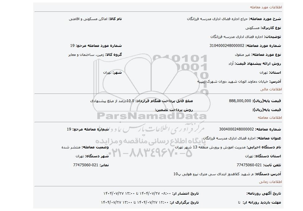 شرح مورد معامله: حراج اجاره فضای اداری مدرسه فرزانگان | نام کالا: اماکن مسکونی و اقامتی | |