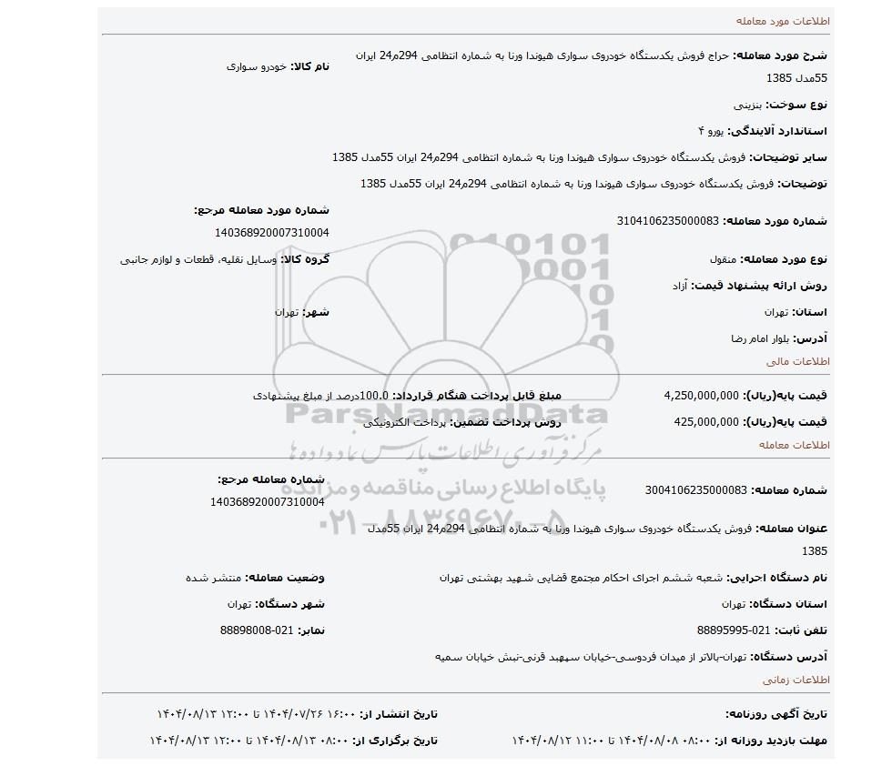 | عنوان معامله: فروش یکدستگاه خودروی سواری هیوندا ورنا به شماره انتظامی 294م24 ایران 55مدل 1385 | ||
