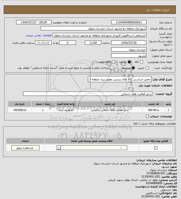 شرح کلی نیاز: تعمیر اساسی چاه های پردیس مطهر بنیاد منطقه 2