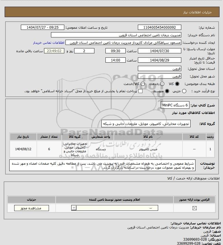 استعلام 6 دستگاه MiniPC, استعلام 6 دستگاه MiniPC