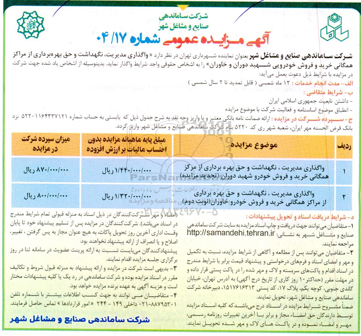 شرکت ساماندهی صنایع و مشاغل شهر بعنوان نماینده شهرداری تهران در نظر دارد «واگذاری مدیریت، نگهداشت و حق بهره برداری از مراکز همگانی خرید و فروش خودرویی شهید دوران و خاوران » را به اشخاص حقوقی واجد شرایط واگذار نماید. بدینوسیله از اشخاص یاد شده جهت شرکت در مزایده با شرایط ذیل دعوت بعمل می آید