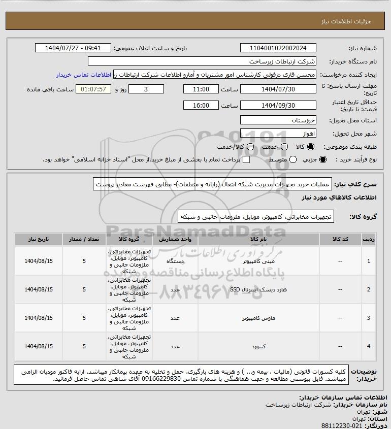 شرح کلی نیاز: عملیات خرید تجهیزات مدیریت شبکه انتقال (رایانه و متعلقات)- مطابق فهرست مقادیر پیوست