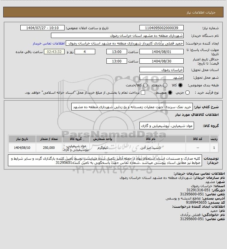 شرح کلی نیاز: خرید نمک سرندی جهت عملیات زمستانه و یخ زدایی شهرداری منطقه ده مشهد