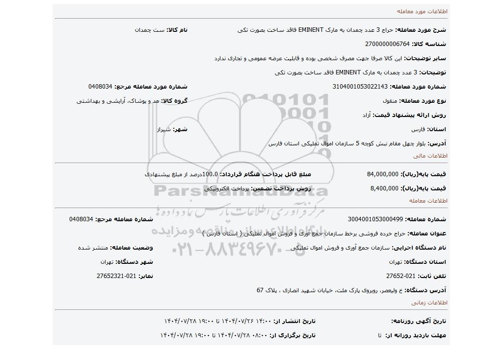 | عنوان معامله: حراج خرده فروشی برخط سازمان جمع آوری و فروش اموال تملیکی ( استان فارس ) | ||