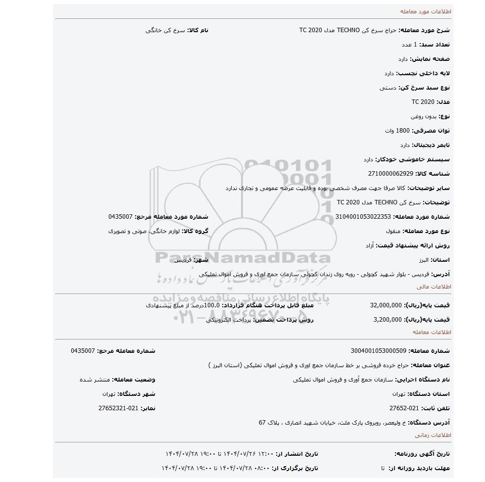 مزایده عمومی مزایده سرخ کن TECHNO مدل TC 2020 برگزار میگردد. از کلیه افراد متخصص و شرکتهای واجد شرایط دعوت به عمل میآید تا در این مزایده با کد خبرگزاری پارس نماد : 9718672 شرکت نمایند تاریخ شروع مزایده : 1404/07/26 مهلت شرکت در مزایده: تا پایان روز 1404/07/28 مکان برگزاری اموال واگذاری استانهای البرز و دستهبندیهای مربوط به این حراجی متفرقه میباشد.
