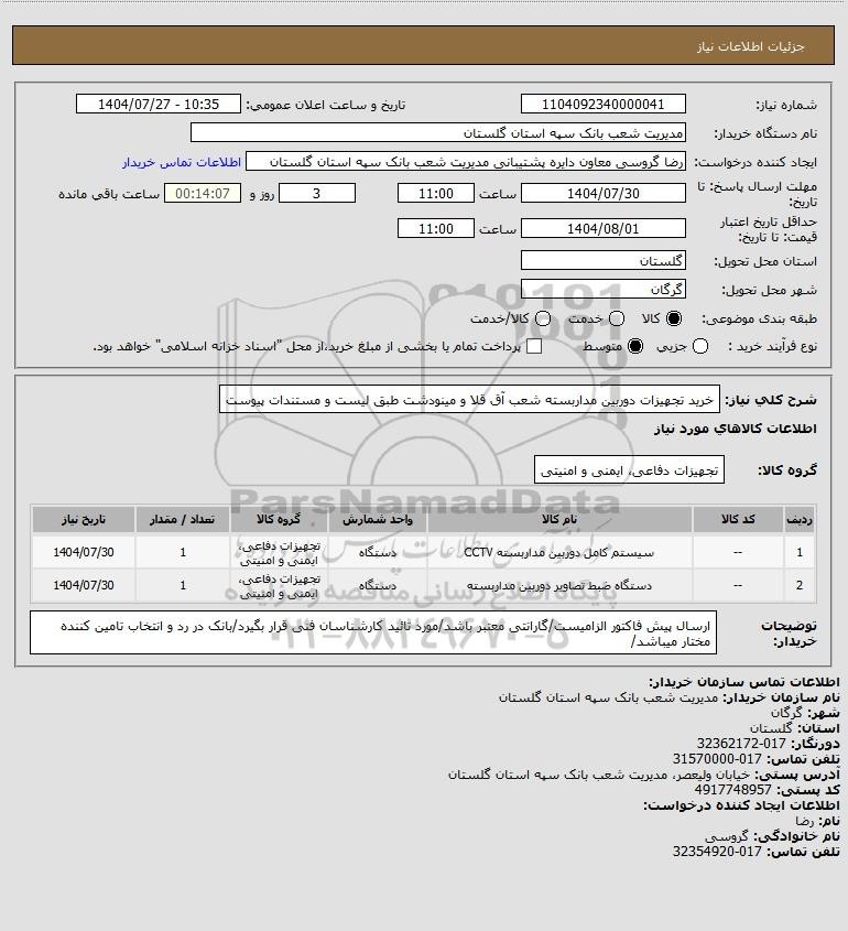 شرح کلی نیاز: خرید تجهیزات دوربین مداربسته شعب آق قلا و مینودشت طبق لیست و مستندات پیوست
