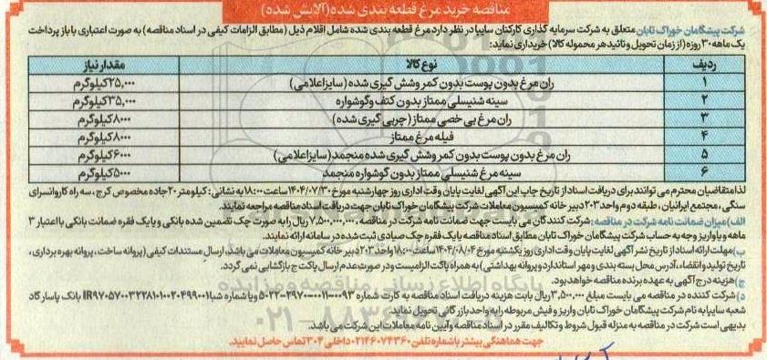 شرکت پیشگامان خوراک تابان متعلق به شرکت سرمایه گذاری کارکنان سایپا در نظر دارد مرغ قطعه بندی شده شامل اقلام ذیل (مطابق الزامات کیفی در اسناد مناقصه) به صورت اعتباری با بازپرداخت یک ماهه 30 روزه (از زمان تحویل و تایید هر محموله کالا) خریداری نماید: