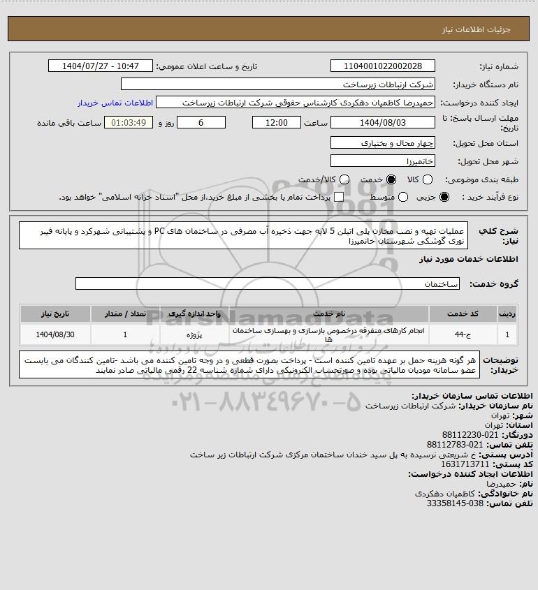 شرح کلی نیاز: عملیات تهیه و نصب مخازن پلی اتیلن 5 لایه جهت ذخیره آب مصرفی در ساختمان های PC و پشتیبانی شهرکرد و پایانه فیبر نوری گوشکی شهرستان خانمیرزا