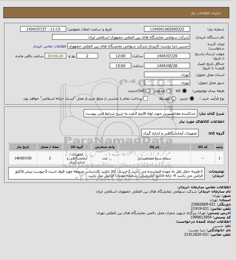 دانلود اسناد مناقصهاستعلام بها و موضوع استعلام استعلام جداکننده مغناطیسی جهت لوله 6اینج 2عدد به شرح شرایط فنی پیوست به اطلاع کلیه شرکتها و افراد متخصص واجد شرایط میرساند، آگهی گذار در نظر دارد از طریق استعلام بها، نسبت به انتخاب و دریافت پیشنهادات اقدام نماید. این استعلام با کد آگهی ثبت شده در سامانه خبرگزاری پارس نماد : 9719393 منتشر شده است. مشخصات استعلام : تاریخ شروع استعلام: 1404/07/27 آخرین مهلت ارسال پیشنهاد قیمت : 1404/07/29 و محل اجرای پروژه : استان تهران میباشد. استعلام قیمت مورد درخواست : استعلام جداکننده مغناطیسی جهت لوله 6اینج 2عدد به شرح شرایط فنی پیوست با دستهبندیهای تخصصی و گروه های مرتبط : ابزار دقیق, خدمات و تجهیزات آزمایشگاهی و پزشکی, استعلام اطلاع رسانی میگردد. شرایط شرکت در استعلام آنلاین : ابتدا ثبت نام در سامانه استعلام پارس نماد و تکمیل مدارک موردنیاز و بارگذاری در سامانه رعایت تمامی ضوابط و الزامات مندرج در اسناد استعلام است.