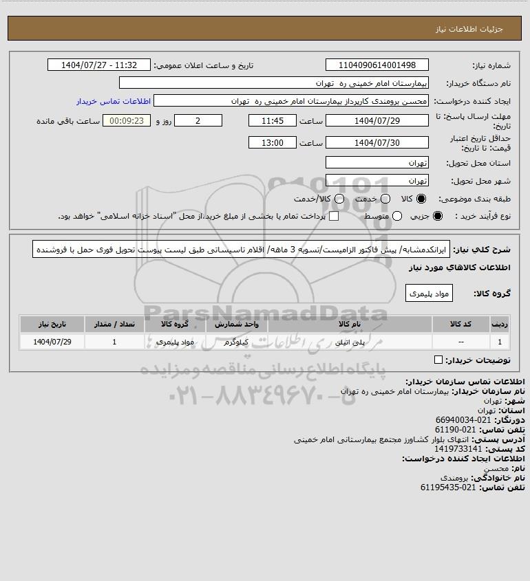 شرح کلی نیاز: ایرانکدمشابه/ پیش فاکتور الزامیست/تسویه 3 ماهه/ اقلام تاسیساتی طبق لیست پیوست
