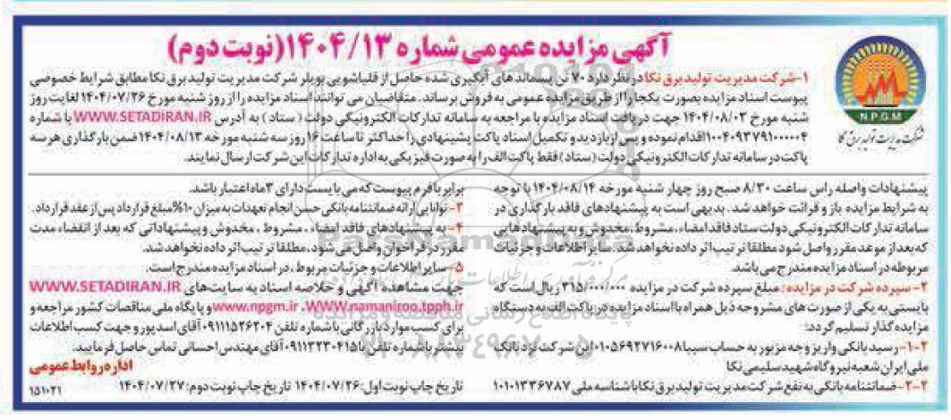 شرکت مدیریت تولید برق نکا در نظر دارد 70 تن پسماندهای آبگیری شده حاصل از قلیاشویی بویلر شرکت مدیریت تولید برق نکا مطابق شرایط خصوصی پیوست اسناد مزایده بصورت یکجا را از طریق مزایده عمومی به فروش برساند. متقاضیان می توانند اسناد مزایده را از روز شنبه مورخ 1404.07.26 لغایت روز شنبه مورخ 1404.08.03 جهت دریافت اسناد مزایده با مراجعه به سامانه تدارکات الکترونیکی دولت ( ستاد) به آدرس ستاد ایران با شماره 1004093791000004 اقدام نموده و پس از بازدید و تکمیل اسناد پاکت پیشنهادی را حداکثر تا ساعت 16 روز سه شنبه مورخه 1404.08.13 ضمن بارگذاری هر سه پاکت در سامانه تدارکات الکترونیکی دولت (ستاد) فقط پاکت الف را به صورت فیزیکی به اداره تدارکات این شرکت ارسال نمایند.