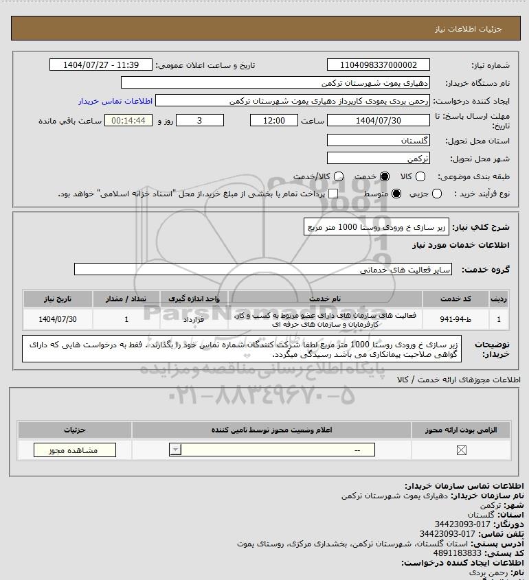 توضیحات خریدار:زیر سازی خ ورودی روستا 1000 متر مربع لطفا شرکت کنندگان شماره تماس خود را بگذارند . فقط به درخواست هایی که دارای گواهی صلاحیت پیمانکاری می باشد رسیدگی میگردد.