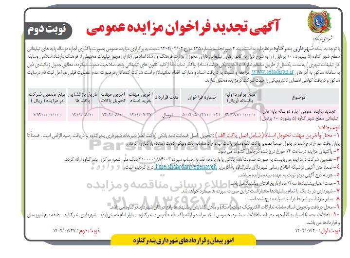 با توجه به اینکه شهرداری بندر گناوه در نظر دارد به استناد بند 2 صورتجلسه شماره 235 مورخ 1404.04.02 نسبت به برگزاری مزایده عمومی بصورت واگذاری اجاره دو ساله پایه های تبلیغاتی سطح شهر گناوه (5 بیلبورد، 10 پرتابل) را به شرح ذیل به کانون های تبلیغاتی دارای مجوز از وزارت فرهنگ و ارشاد اسلامی (دارای مجوز تبلیغات محیطی از فرهنگ و ارشاد اسلامی و سابقه کار تبلیغات شهری) به مدت یک سال از طریق سامانه تدارکات الکترونیکی دولت (ستاد) واگذار نماید. لذا از کلیه کانون های تبلیغاتی واجد صلاحیت دعوت می گردد مطابق جدول زمان بندی ذیل به سامانه مذکور به آدرس ستاد ایران مراجعه و نسبت به دریافت اسناد و مدارک اقدام نمایند. لازم است شرکت کنندگان در صورت عدم عضویت قبلی مراحل ثبت نام در سایت مذکور و دریافت گواهی امضای الکترونیکی را جهت شرکت در مزایده محقق سازند.