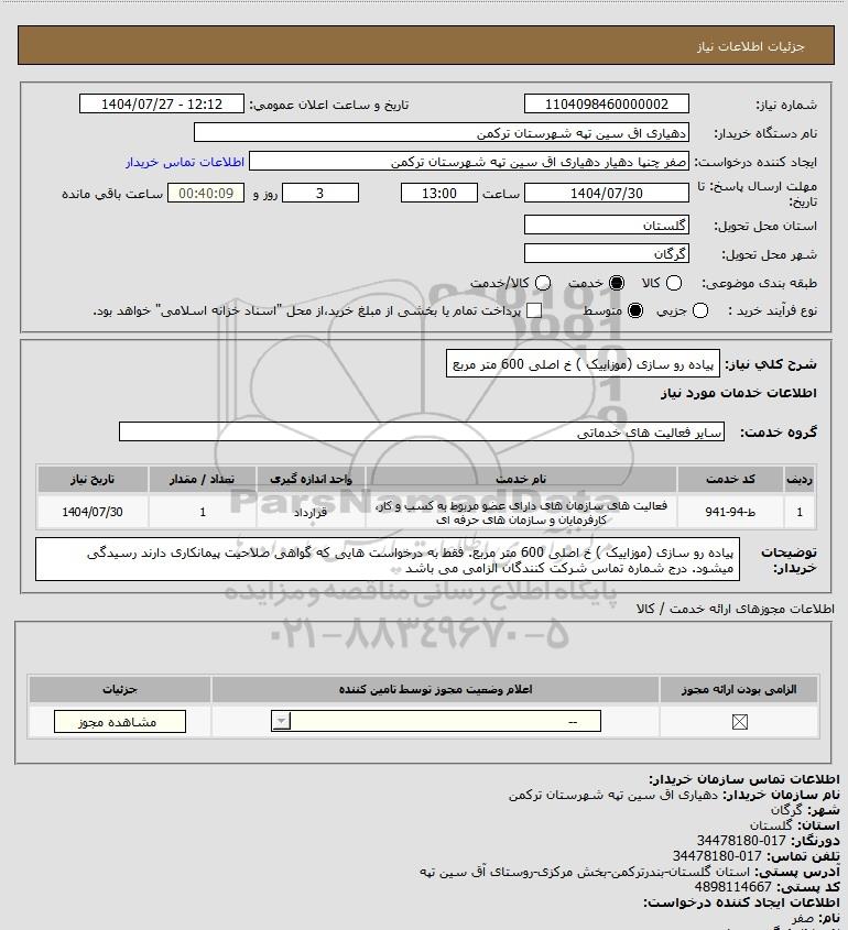 توضیحات خریدار:پیاده رو سازی (موزاییک ) خ اصلی 600 متر مربع. فقط به درخواست هایی که گواهی صلاحیت پیمانکاری دارند رسیدگی میشود. درج شماره تماس شرکت کنندگان الزامی می باشد