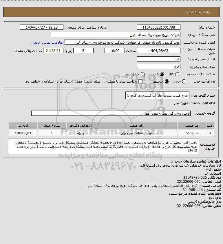 شرح کلی نیاز: طرح کنترل پذیری چاه آب کشاورزی گروه 1