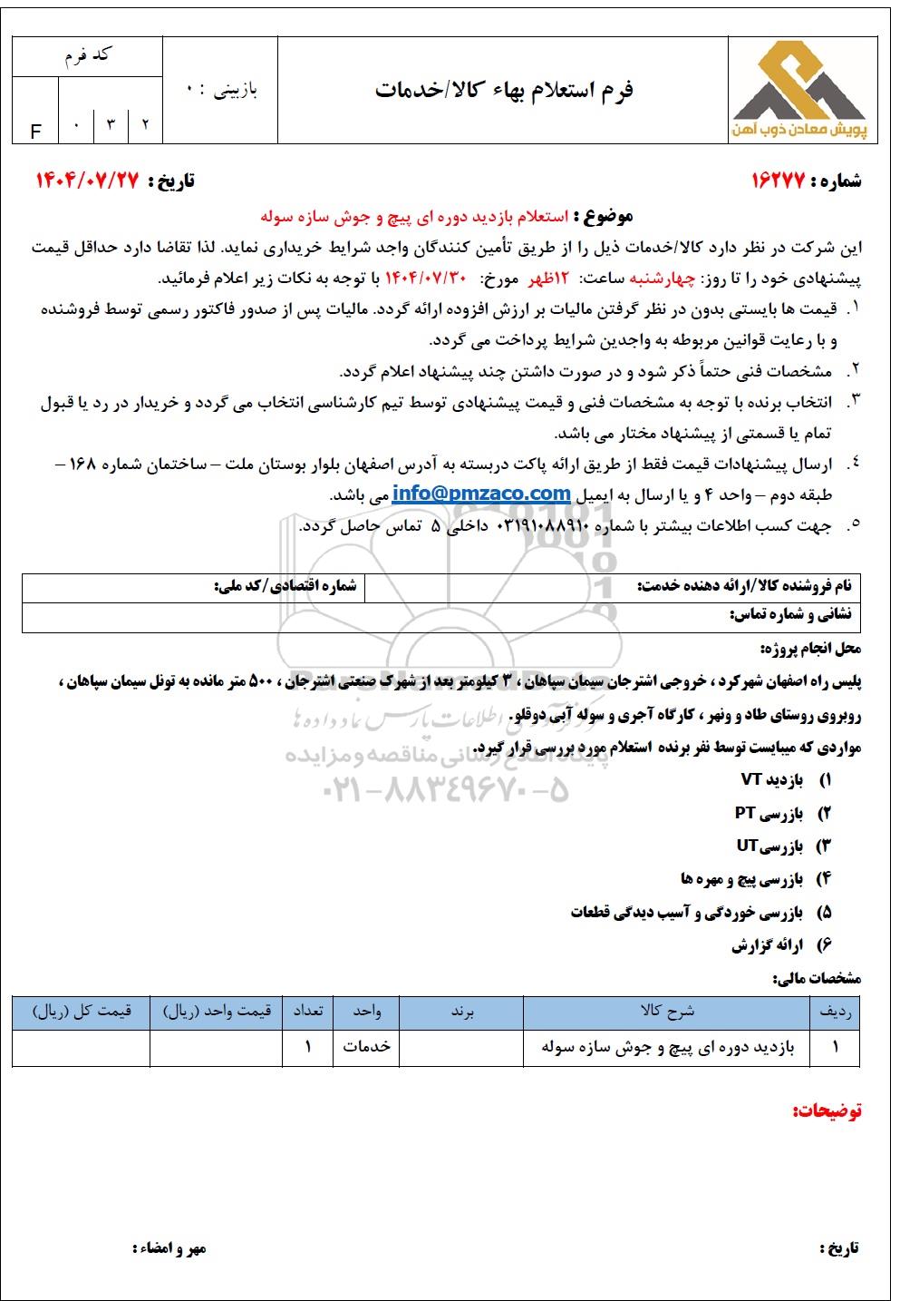 موضوع : استعلام بازدید دوره ای پیچ و جوش سازه سوله