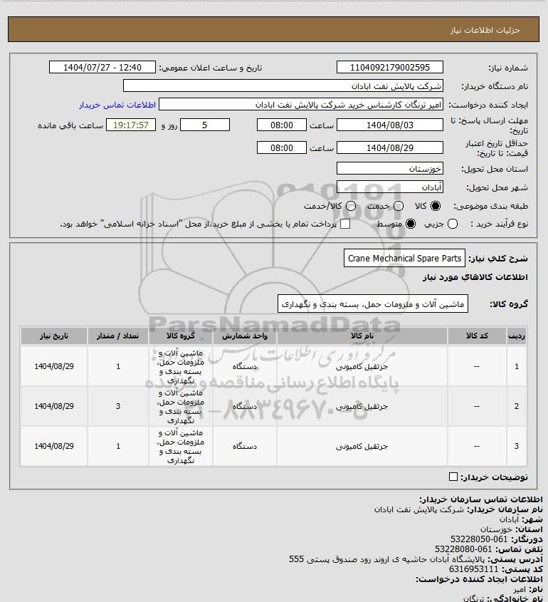 شرح کلی نیاز: Crane Mechanical Spare Parts