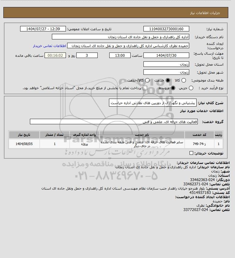 شرح کلی نیاز: پشتیانی و نگهداری از دوربین های نظارتی اداره حراست