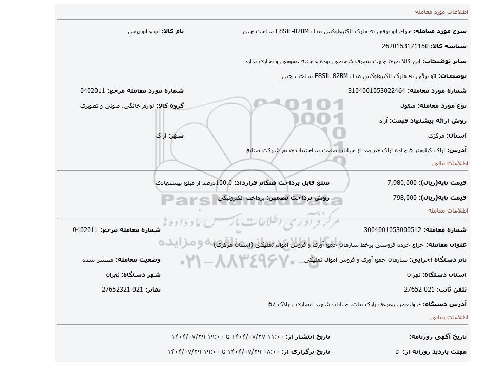 | عنوان معامله: حراج خرده فروشی برخط سازمان جمع آوری و فروش اموال تملیکی (استان مرکزی) | ||