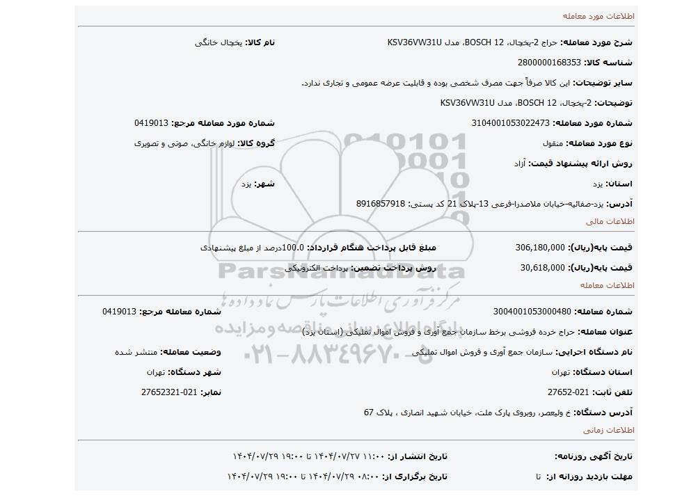 | شماره مورد معامله: 3104001053022473 | شماره مورد معامله مرجع: 0419013 | |