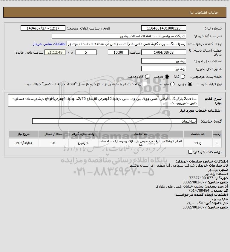 شرح کلی نیاز: ساخت2 پارکینگ باقوطی آهنی وورق پی وی سی درطول12وعرض 6ارتفاع 2/70...وطول 6وعرض4اواقع درشهرستان عسلویه طبق تصویرپیوست