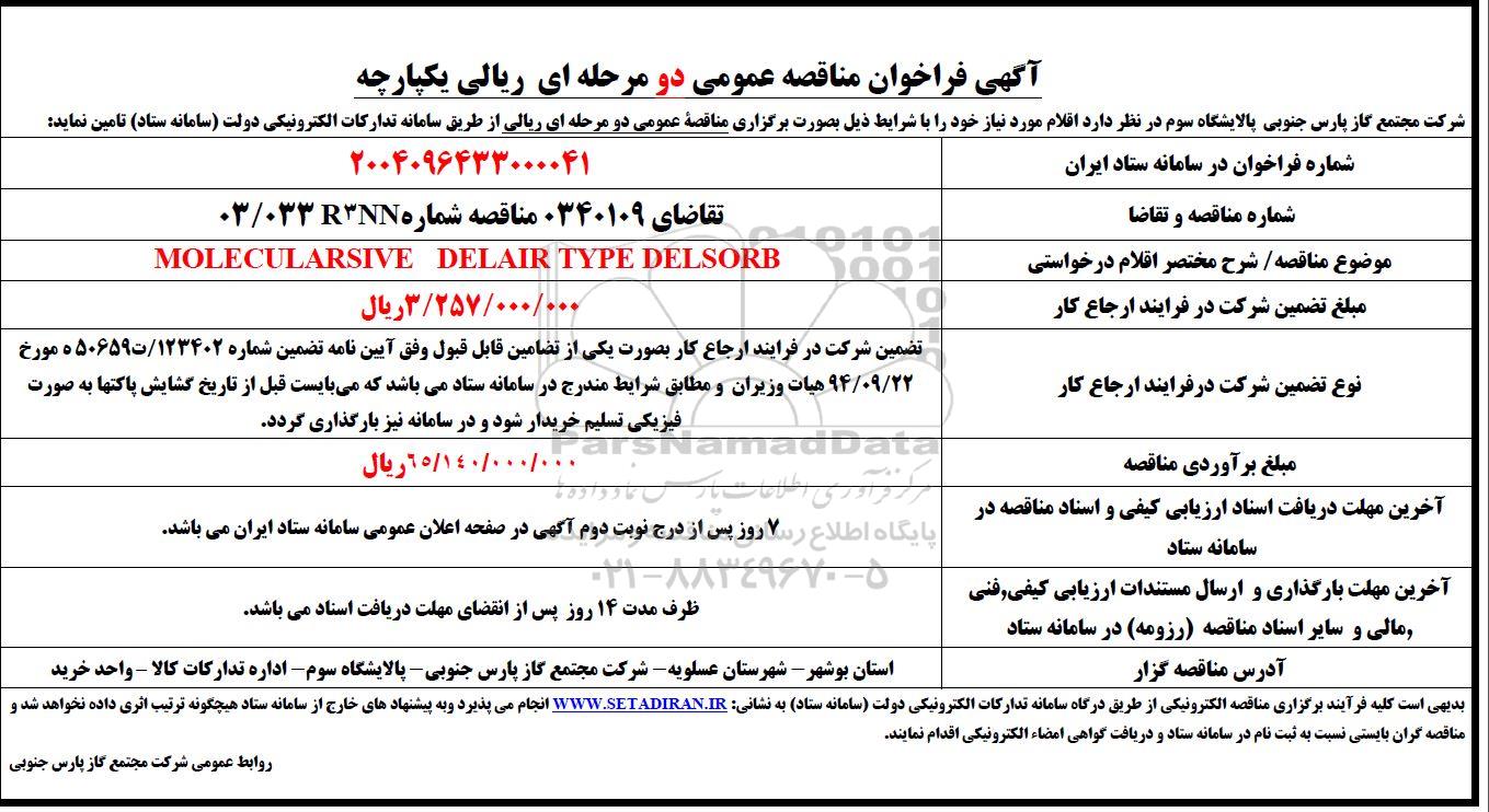 شرکت مجتمع گاز پارس جنوبی پالایشگاه سوم در نظر دارد اقلام مورد نیاز خود را با شرایط ذیل به صورت مناقصه عمومی دو مرحله ای ریالی از طریق سامانه تدارکات الکترونیکی دولت سامانه ستاد تامین نماید.