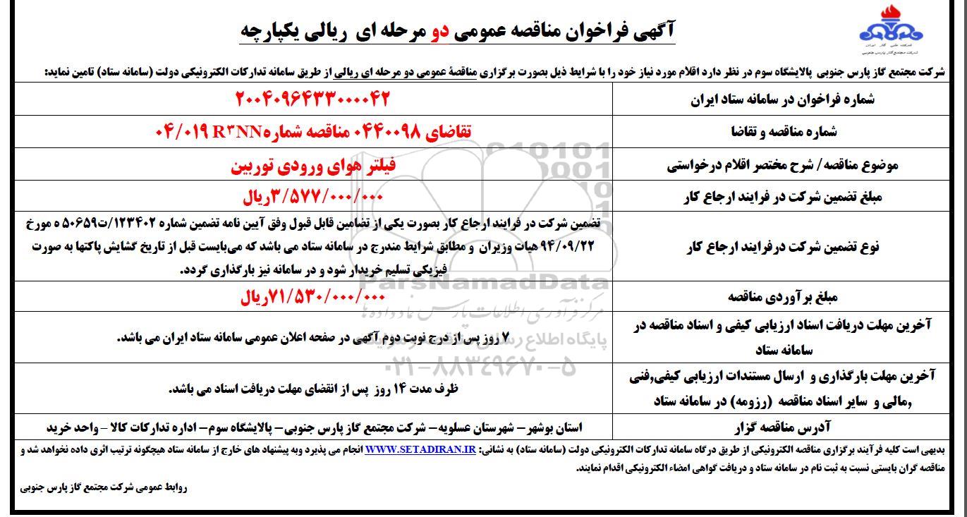 شرکت مجتمع گاز پارس جنوبی پالایشگاه سوم در نظر دارد اقلام مورد نیاز خود را با شرایط ذیل به صورت مناقصه عمومی دو مرحله ای یکپارچه از طریق سامانه تدارکات الکترونیکی دولت سامانه ستاد تامین نماید.