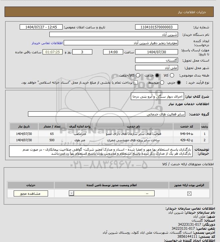 شرح کلی نیاز: اجرای دیوار سنگی و آبرو بتنی درجا