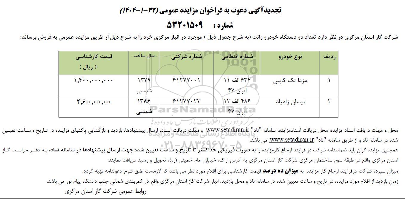 شرکت گاز استان مرکزی در نظر دارد تعداد دو دستگاه خودرو وانت ( به شرح جدول ذیل ) موجود در انبار مرکزی خود را به شرح ذیل از طریق مزایده عمومی به فروش برساند