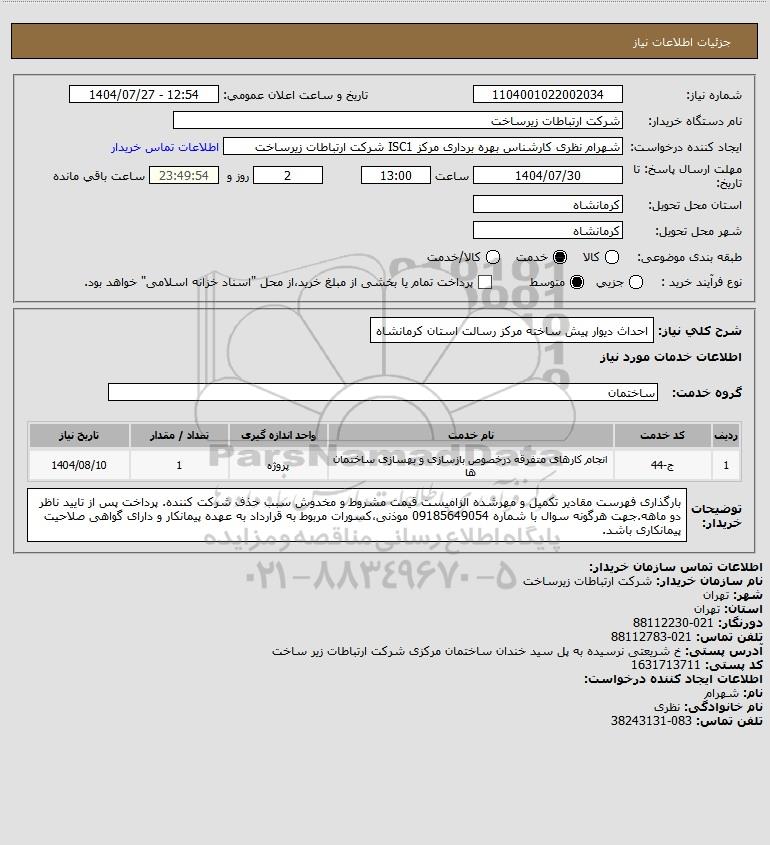 شرح کلی نیاز: احداث دیوار پیش ساخته مرکز رسالت استان کرمانشاه