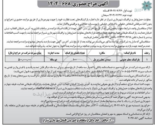 معاونت حمل و نقل و ترافیک شهرداری شیراز در نظر دارد اجاره پارکینگهای تحت نظارت خود را جهت بهره برداری از طریق مزایده حضوری (حراج) و بدون اخذ سرقفلی اشخاص حقوقی یا اشخاص حقیقی یا موسسات حفاظتی و مراقبتی واگذار نماید.