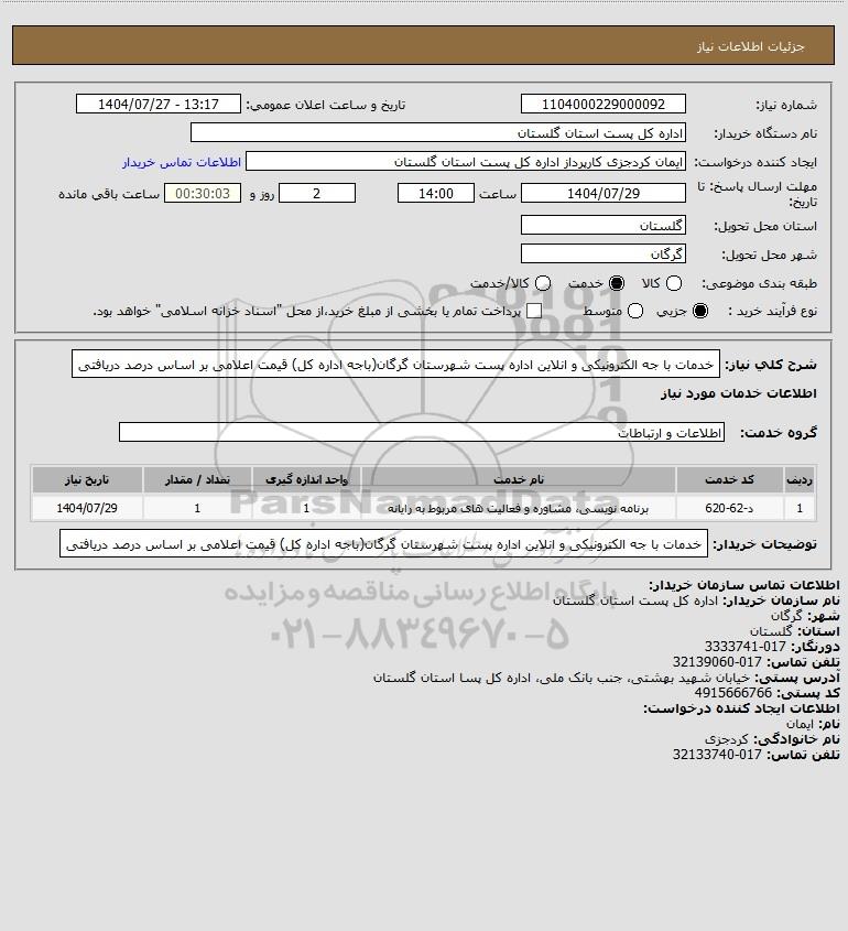 استعلام خدمات با جه الکترونیکی و انلاین اداره پست شهرستان گرگان(باجه اداره کل) قیمت اعلامی بر اساس درصد دریافتی, استعلام خدمات با جه الکترونیکی و انلاین اداره پست شهرستان گرگان(باجه اداره کل) قیمت اعلامی بر اساس درصد دریافتی