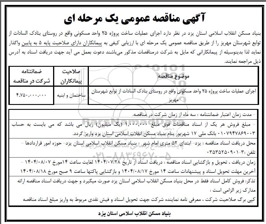 بنیاد مسکن انقلاب اسلامی استان یزد در نظر دارد اجرای عملیات ساخت پروژه 25 واحد مسکونی واقع در روستای بنادک السادات از توابع شهرستان مهریز  را از طریق مناقصه عمومی یک مرحله ای با ارزیابی کیفی به پیمانکاران دارای صلاحیت  پایه 5 به پایین واگذار نماید.  لذا بدینوسیله از پیمانکارانی که مایل به شرکت در مناقصات مذکور میباشند دعوت بعمل می آید جهت دریافت اسناد به آدرس ذیل مراجعه نمایند.