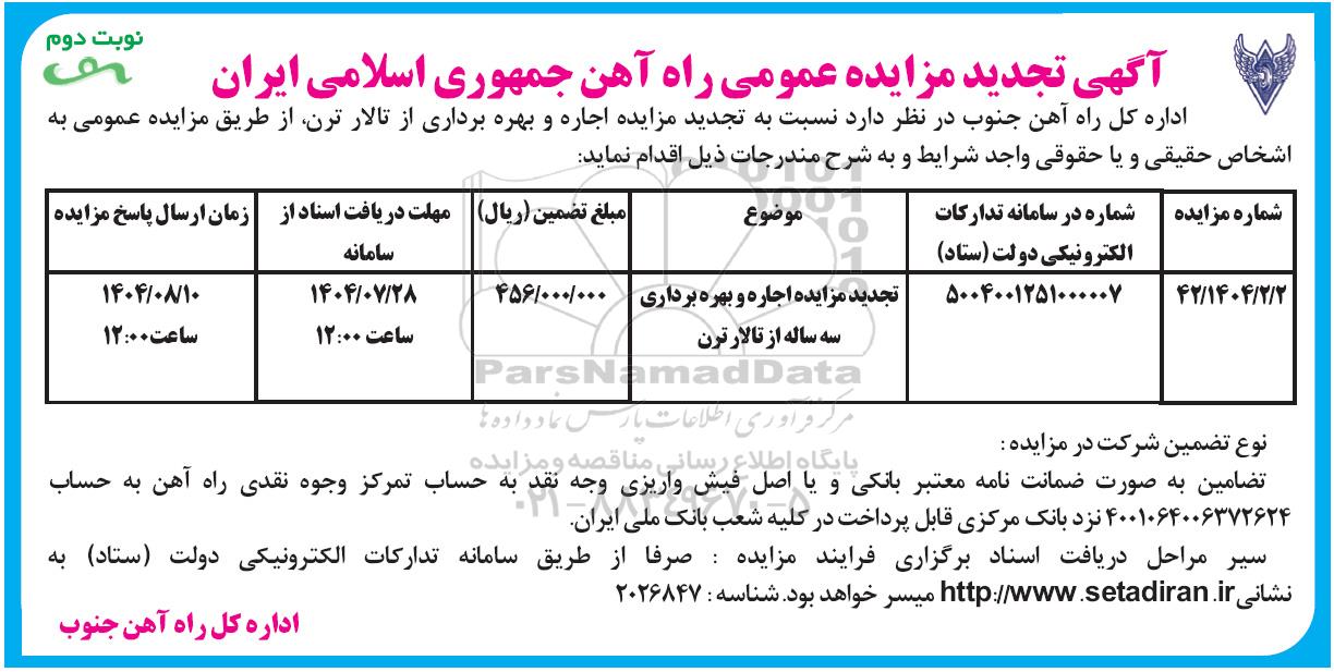 اداره کل راه آهن جنوب در نظر دارد نسبت به تجدید مزایده اجاره و بهره برداری از تالار ترن از طریق مزایده عمومی به اشخاص حقیقی یا حقوقی واجد شرایط و به شرح مندرجات ذیل اقدام نماید: