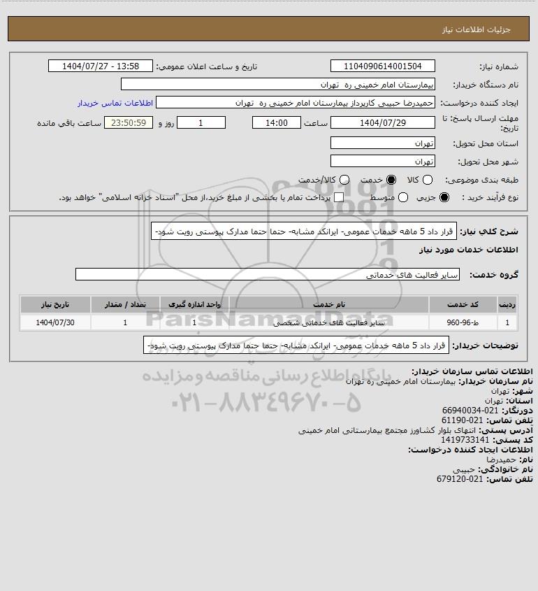 شرح کلی نیاز: قرار داد 5 ماهه خدمات عمومی- ایرانکد مشابه- حتما حتما مدارک پیوستی رویت شود-