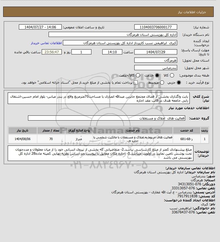 شرح کلی نیاز: بابت واگذاری بخشی از فضای مجتمع جابربن عبدالله انصاری با مساحت70مترمربع واقع در بندر عباس- بلوار امام حسین-اشتغال زایی جامعه هدف در قالب عقد اجاره